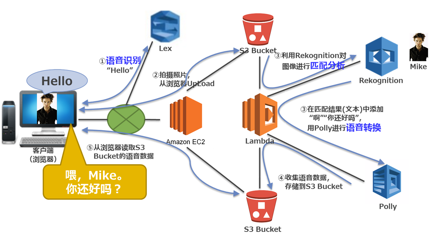 在AWS上构建团结亚马逊人工智能效劳的系统,,,,,,,,将对话中检测到的要害词和从相机图像中获取的照片上传到云端,,,,,,,,举行剖析,,,,,,,,反响适当的问候语音