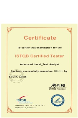 2023 年 5 月,,,,,,,我司8 名员工获得 ISTQB 基础级资格,,,,,,,2023 年 12 月,,,,,,,我们又取得了ISTQB“金牌相助同伴”认证。。。。。。 以后我们将继续提高专业评估手艺,,,,,,,为中国和全球客户提供更专业的评估测试效劳。。。。。。